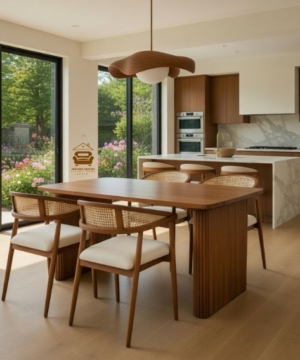 Tak kalah menarik juga, kursi sebagai pelengkap dari meja memberikan kesan modern kontemporer, karena terdapat anyaman rotan asli. Perpaduan kayu jati dengan corak yang indah, serta sandaran terdapat rotan yang memberikan sentuhan alami sekaligus meningkatkan kenyamanan saat digunakan. Duduk lebih santai, tidak panas, dan tetap stylish. Set meja makan kayu jati ini sangat cocok untuk saat makan bersama keluarga atau menjamu tamu spesial.
